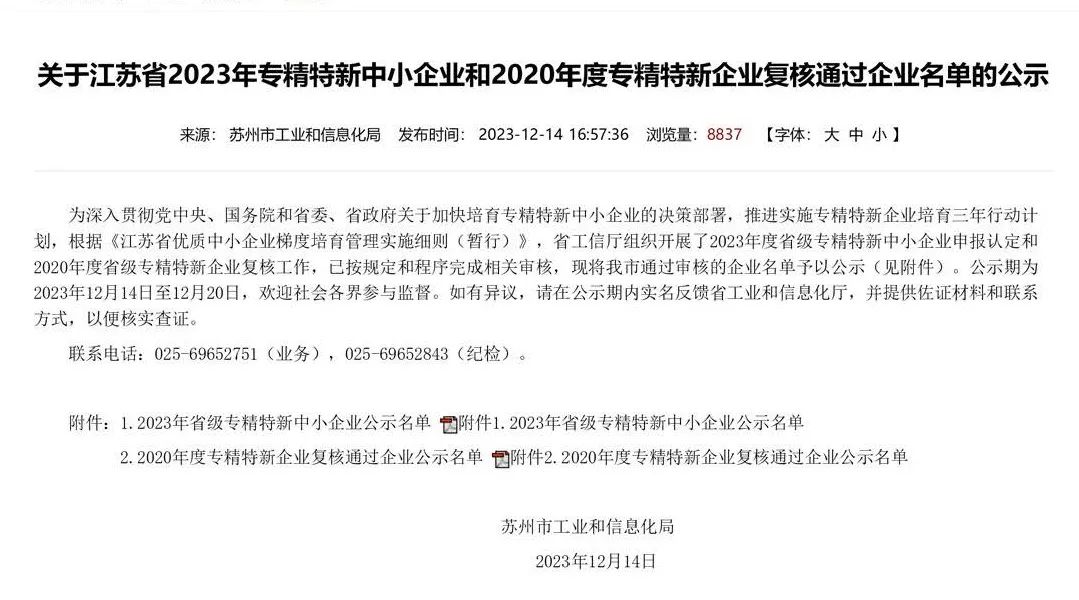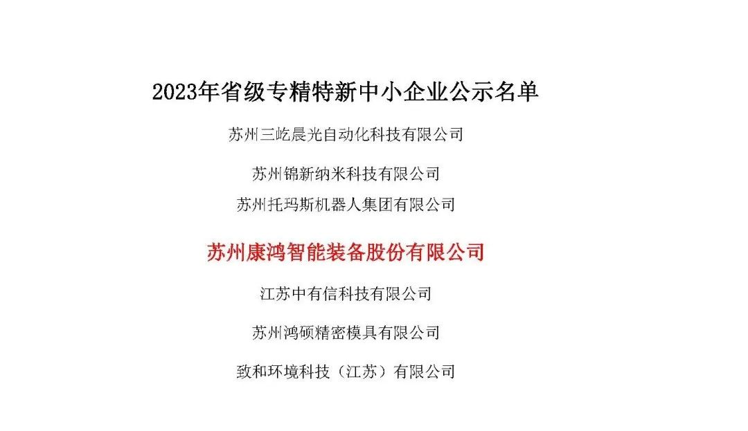 2023年12月14日,苏州市工业和信息化局正式公布2023年江苏省“专精特新”中小企业公示名单,目前公示已结束,苏州康鸿智能装备股份有限公司荣获江苏省“专精特新”中小企业荣誉称号。